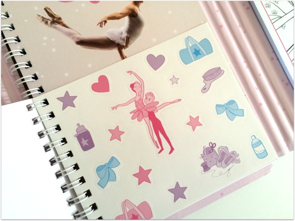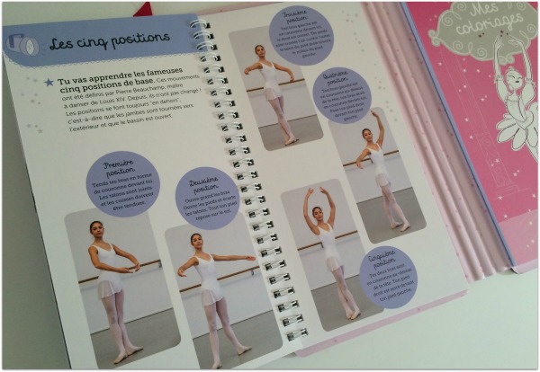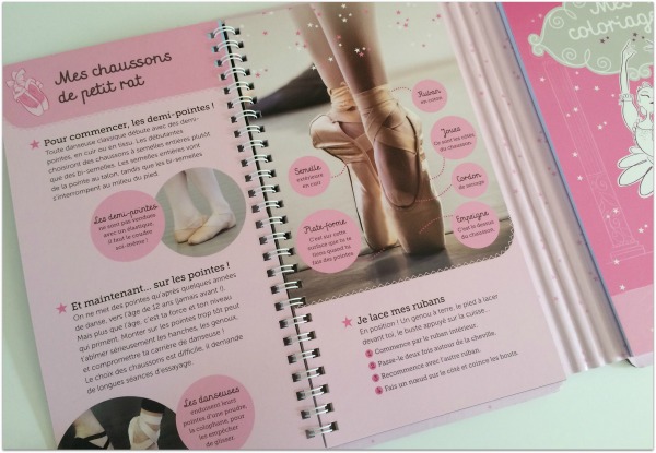 Un carnet à spirale de 12 double-pages avec photos : Je prépare ma tenue de danseuse, Mes chaussons, Je me coiffe comme une danseuse, Les cinq positions, Les exercices à la barre, Le studio de danse, Les portés et pas de deux, Les grands ballets emblématiques…