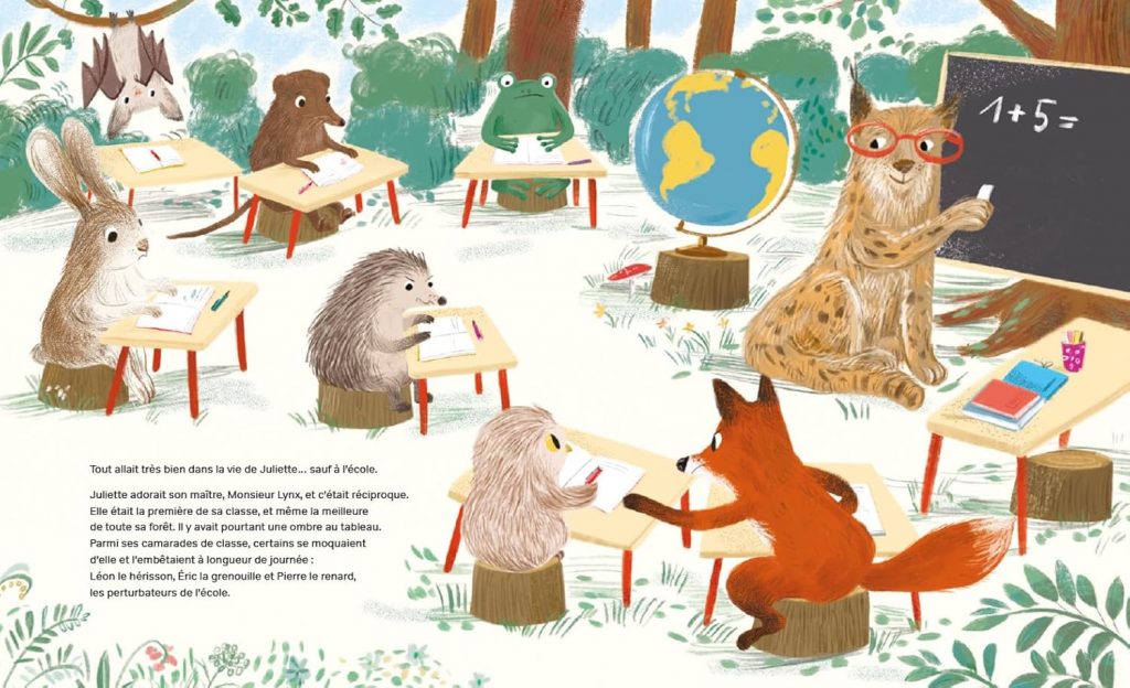 Parmi ses camarades, certains se moquaient d’elle et l’embêtaient à longueur de journée : Léon le hérisson, Eric la grenouille et Pierre le renard, les pertirbateurs de l’école…