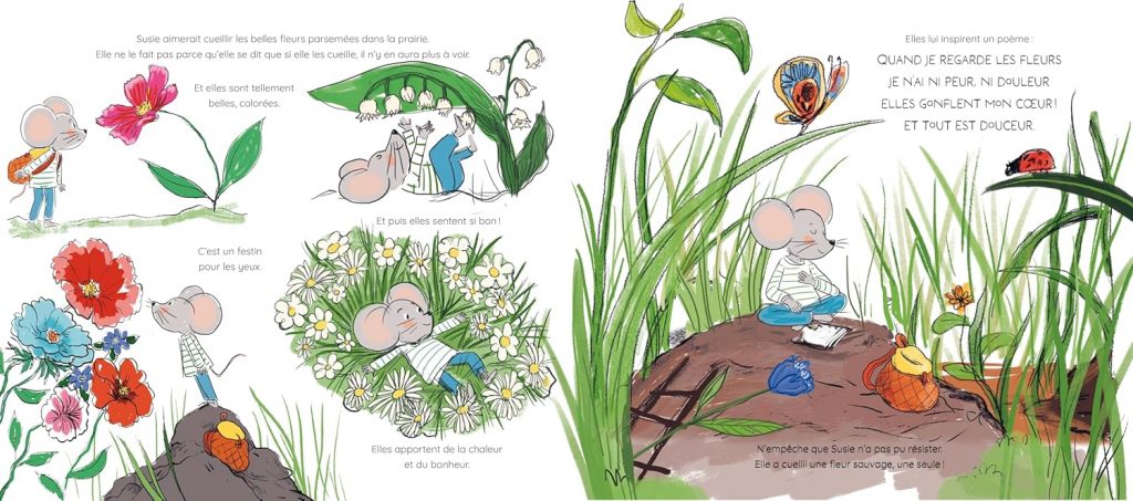 Coup de coeur pour ce texte très personnel de Susie Morgentern dans lequel on retrouve son style unique et son amour pour la poésie et la nature. Les enfants aiment Susie, la petite souris déjà rencontrée dans l’album Susie la souris qui lit.