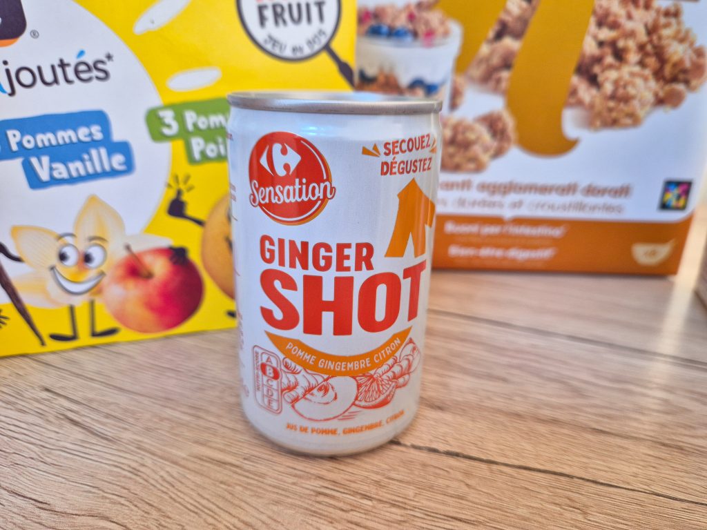 Ginger Shot Carrefour Sensation, à moins de 1 euro, c’est l’allié idéal pour démarrer ou redémarrer sa journée. A base de pur jus de pomme, gingembre et citron, il est épicé et réveille les papilles. On le trouve au rayon snacking chez Carrefour.