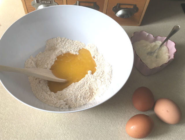 Faire un puits, y verser le beurre fondu, le yaourt, les oeufs et l’arôme choisi.